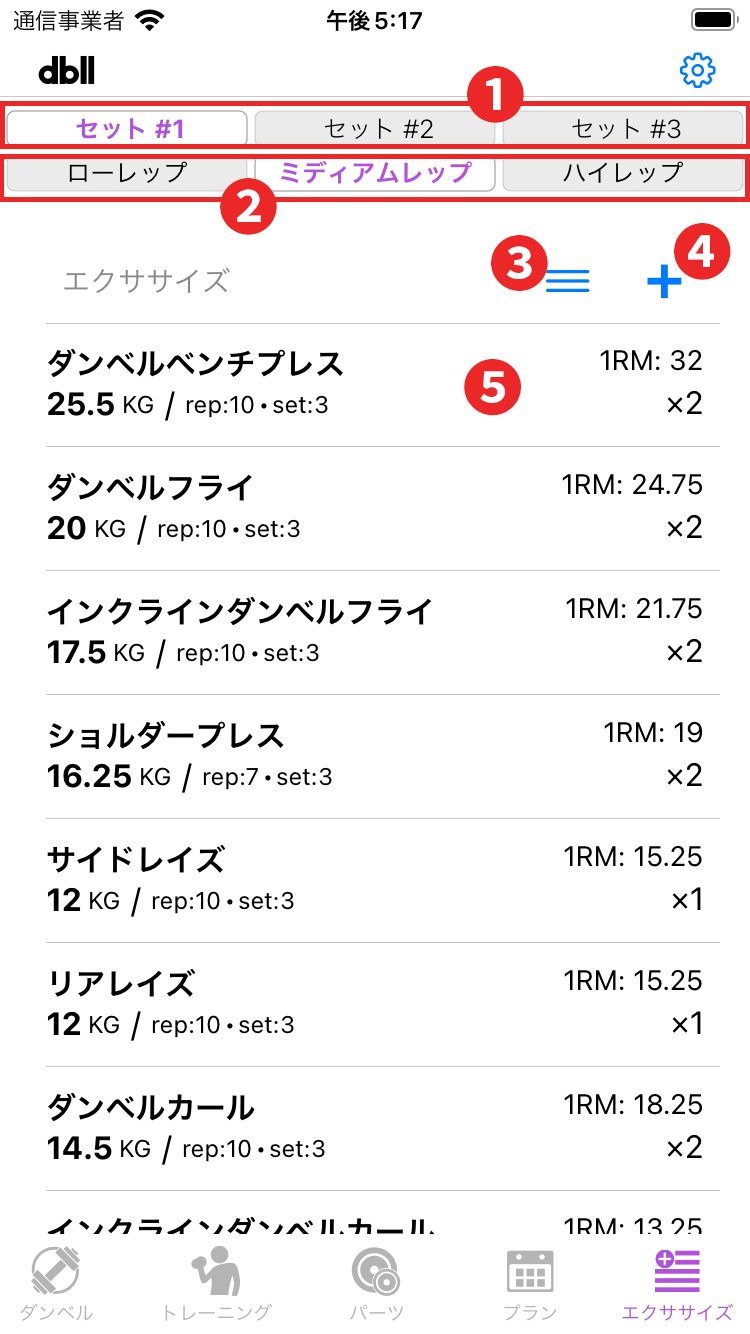- 使用本数 エクササイズで使用するダンベルの本数を選択します。