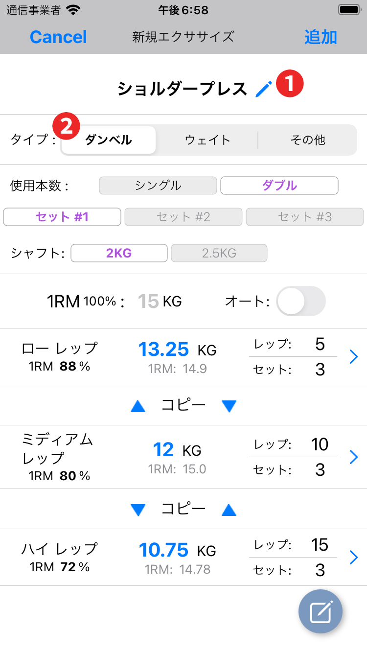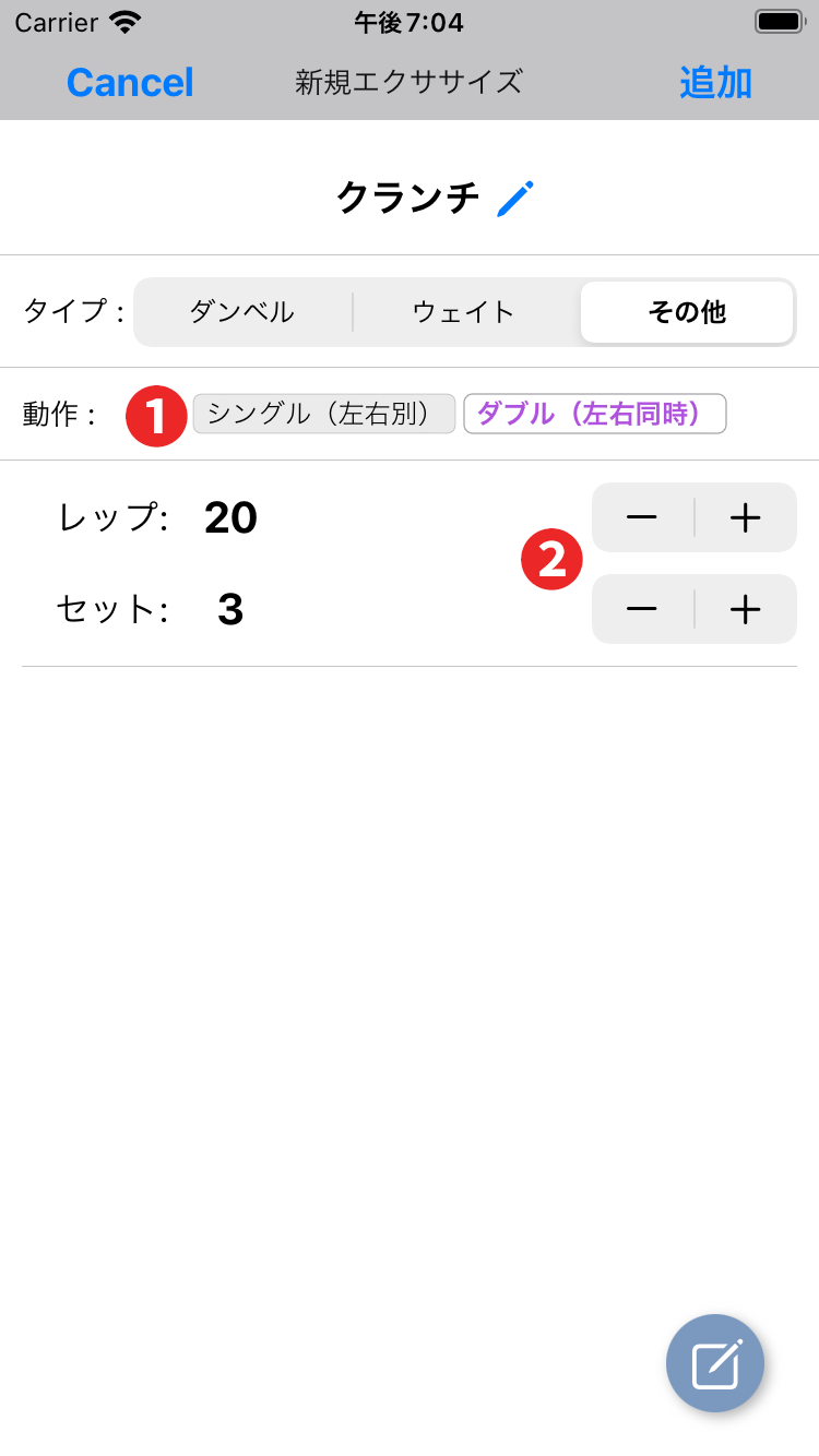 - 追加ボタン タップすると新規エクササイズを追加する画面に移ります。新規エクササイズを追加