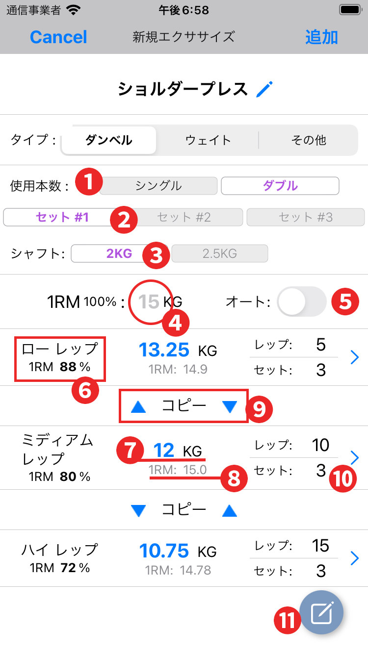 - コピー ▲▼の方向へ1RMをコピーします。(計算上小数点以下の誤差があります)あらかじめコピー先のレップ数を設定してからコピーしてください。コピー先のレップモードの重量がそのレップモード のレップ数に応じて自動でセットされます。