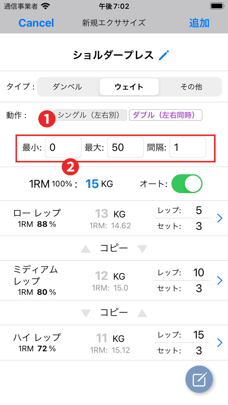 ※1RMとは1レップ(1回)で挙げることができる最大重量です。 - オート エクササイズでの1RMがわかっている場合、オンにして1RMを選択すれば各レップモードの重量がそれぞれのレップ数に応じて自動でセットされます。