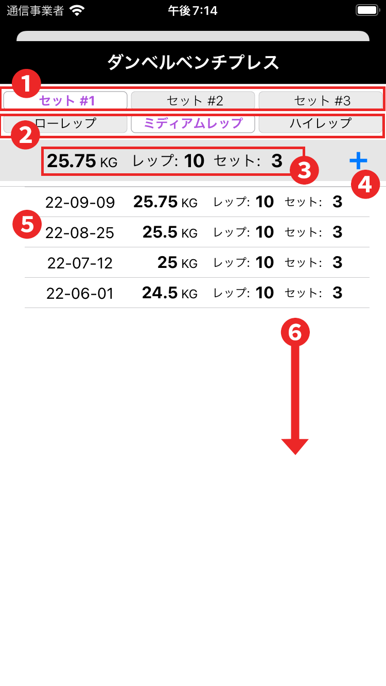 - 追加ボタン 現在の重量(エクササイズのタイプが「その他」以外)、レップ数、セット数を日付と共に履歴リストに追加します。