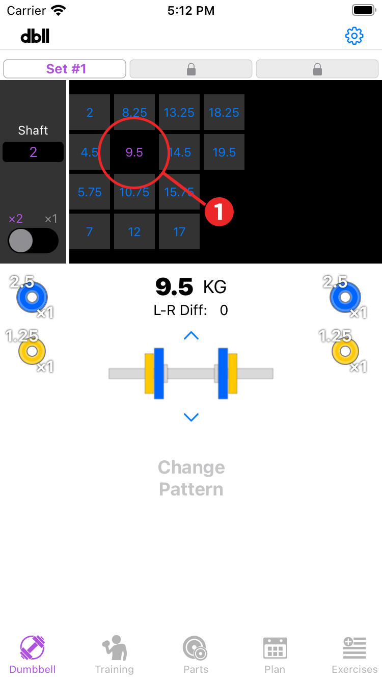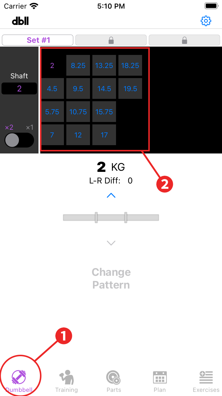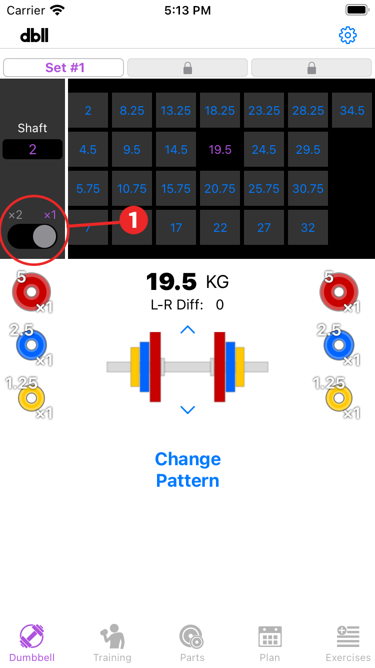 By tapping the ×2 or ×1 button, you can check the difference in usable weight between using one dumbbell and using two dumbbells.