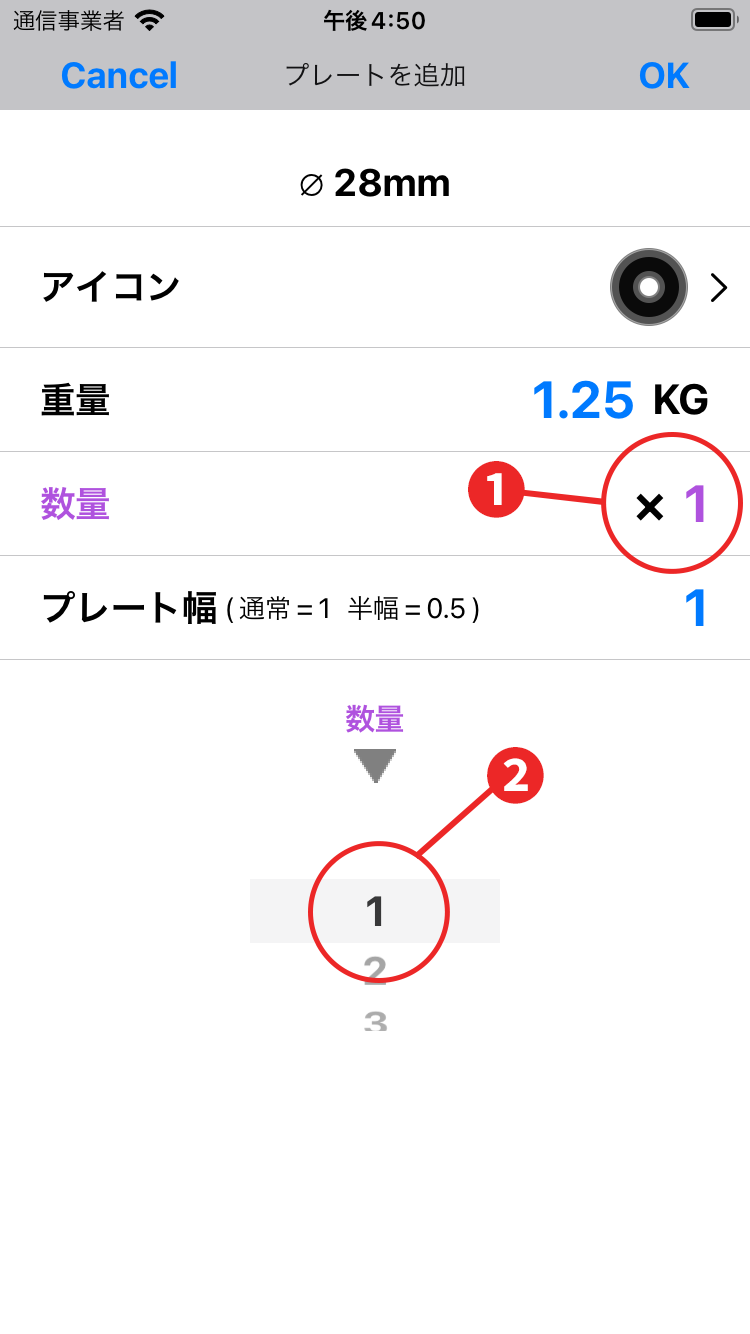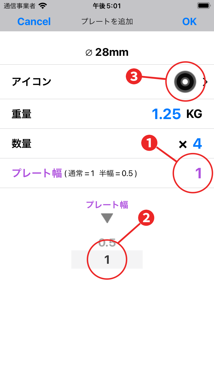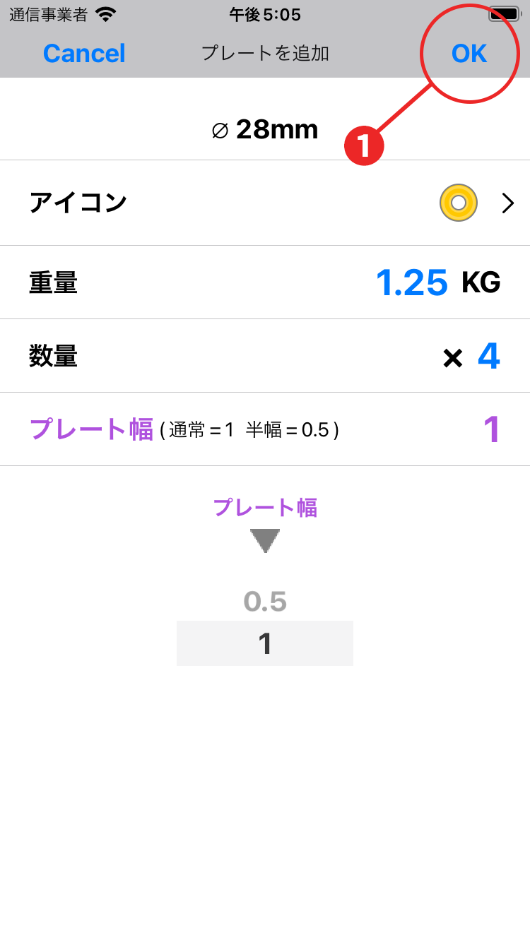 - ホイール選択部でプレート幅を選択します。プレート幅は、通常のものは1、半分の幅のプレートは0.5です。