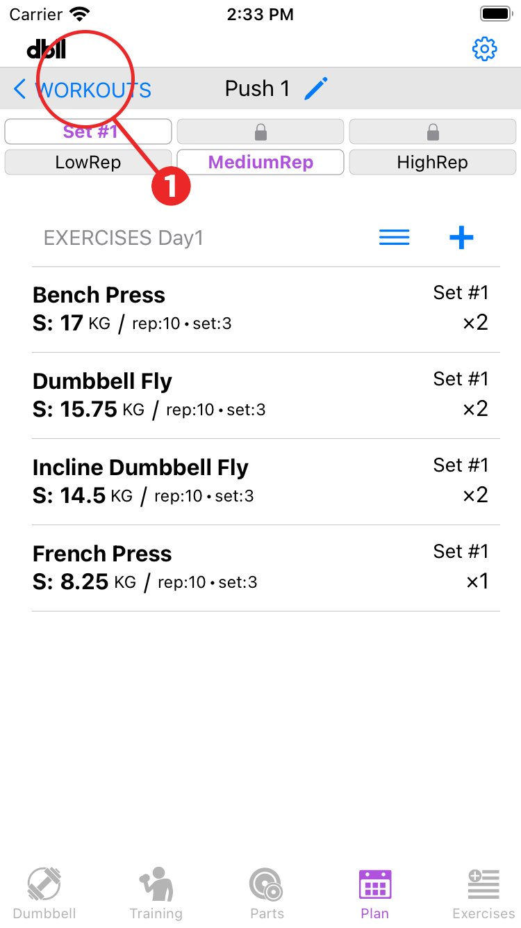 - When you have completed all the exercise registrations for the first day, tap "Workout" to return to the workout.