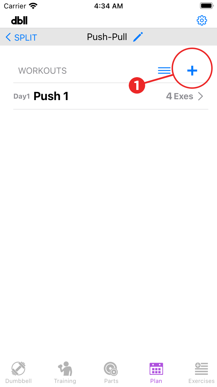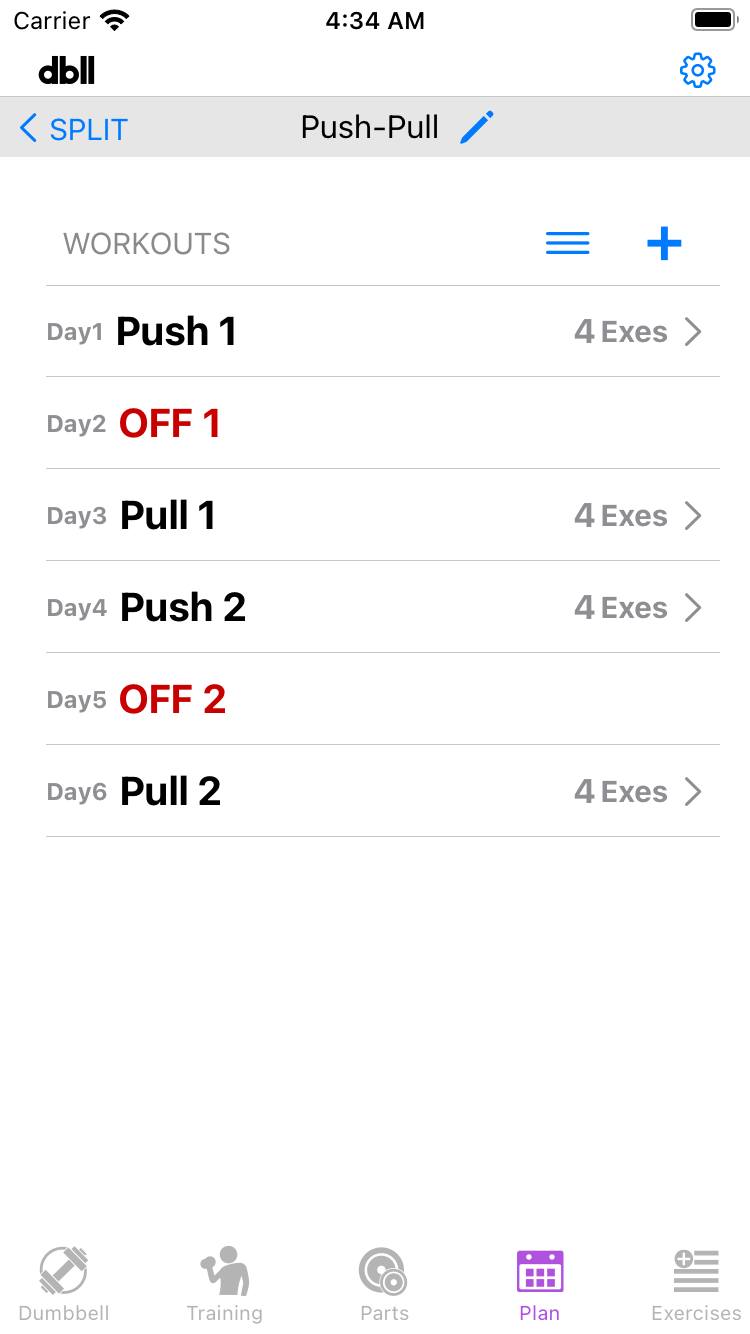Example is 'Push-Pull' for the split, day 1 is 'Push 1', 4 exercises for that day.