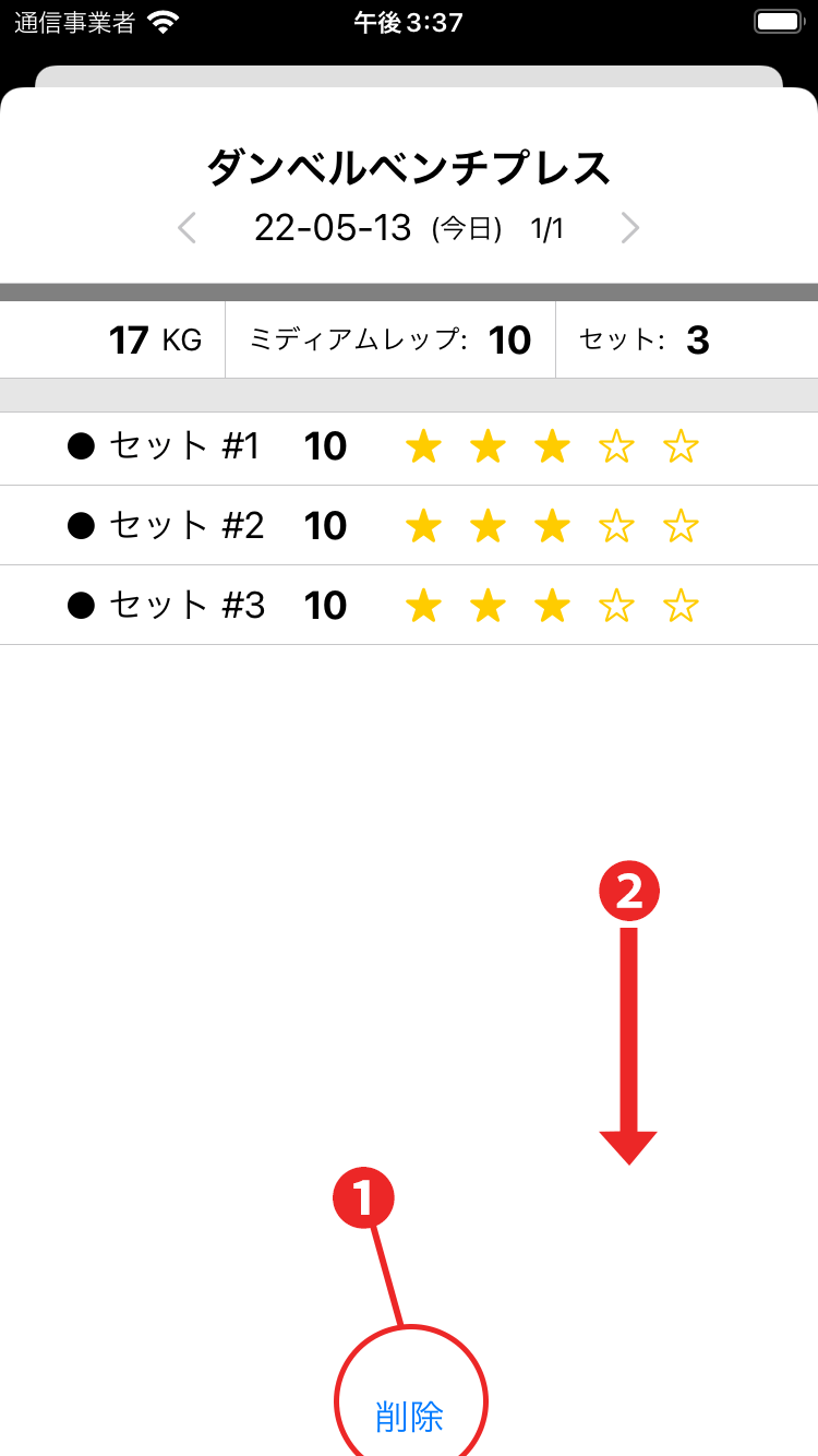 次のセット以降のボタンを全てタップして最初のエクササイズを終了してください。