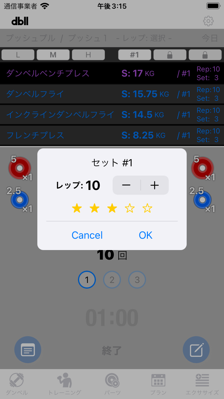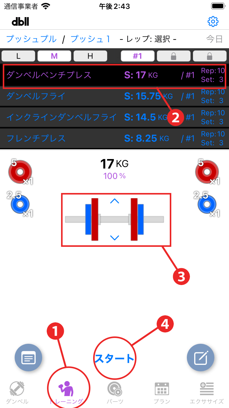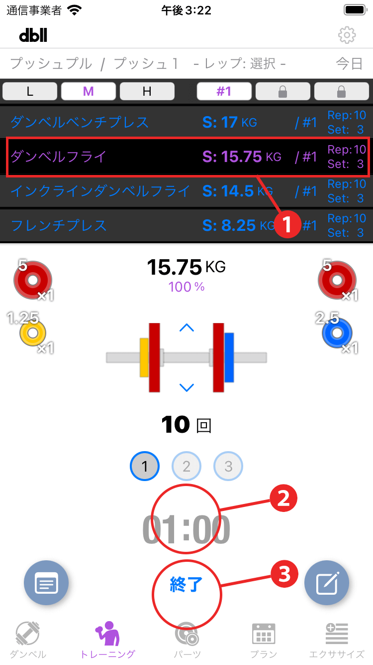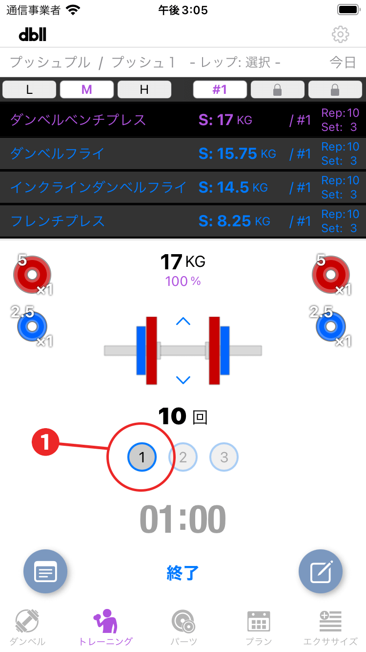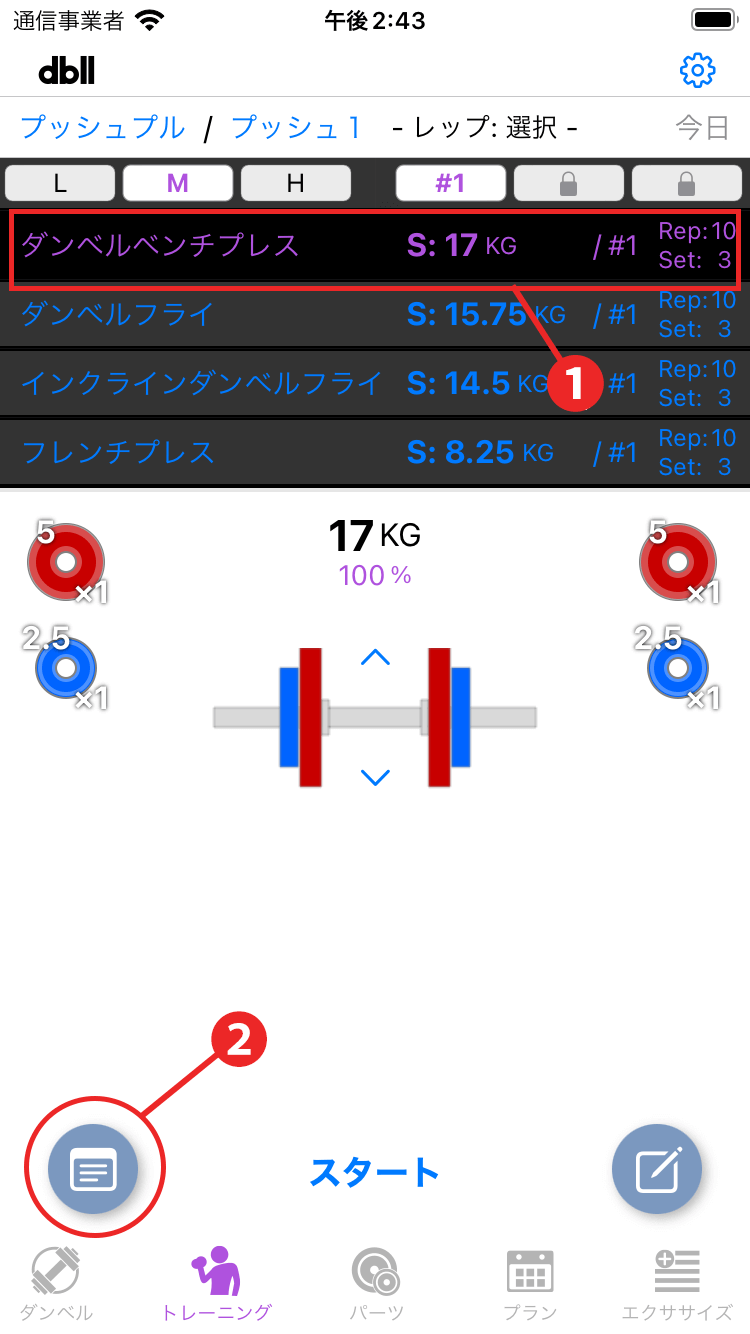 - 選択されたエクササイズで使用するダンベルが表示されています。